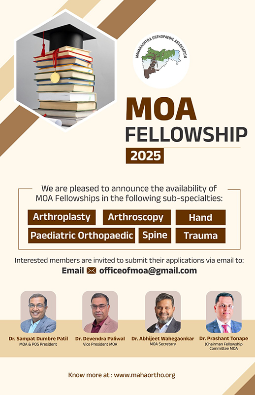 Maharashtra Orthopaedic Association brings more than 38 years’ experience and is a platform for Orthopaedic Surgeons mainly from Maharashtra. Today, MOA has more than 2,000 members comprising primarily of Orthopaedic Consultants and trainees (registrars) in hospitals spanning all Orthopaedic Subspecialties
