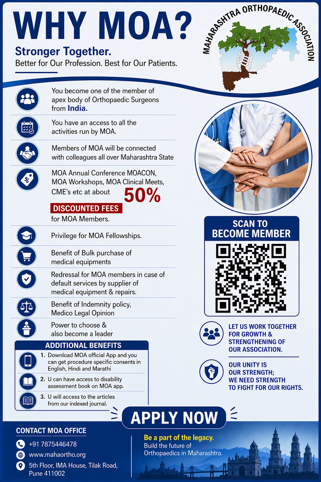 Maharashtra Orthopaedic Association brings more than 38 years’ experience and is a platform for Orthopaedic Surgeons mainly from Maharashtra. Today, MOA has more than 2,000 members comprising primarily of Orthopaedic Consultants and trainees (registrars) in hospitals spanning all Orthopaedic Subspecialties