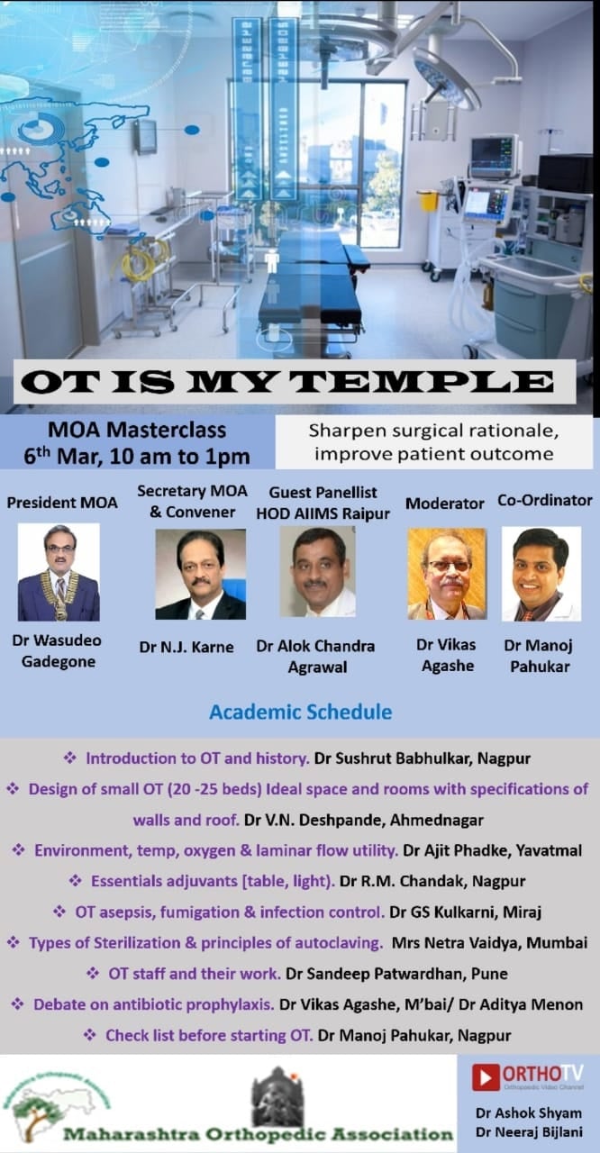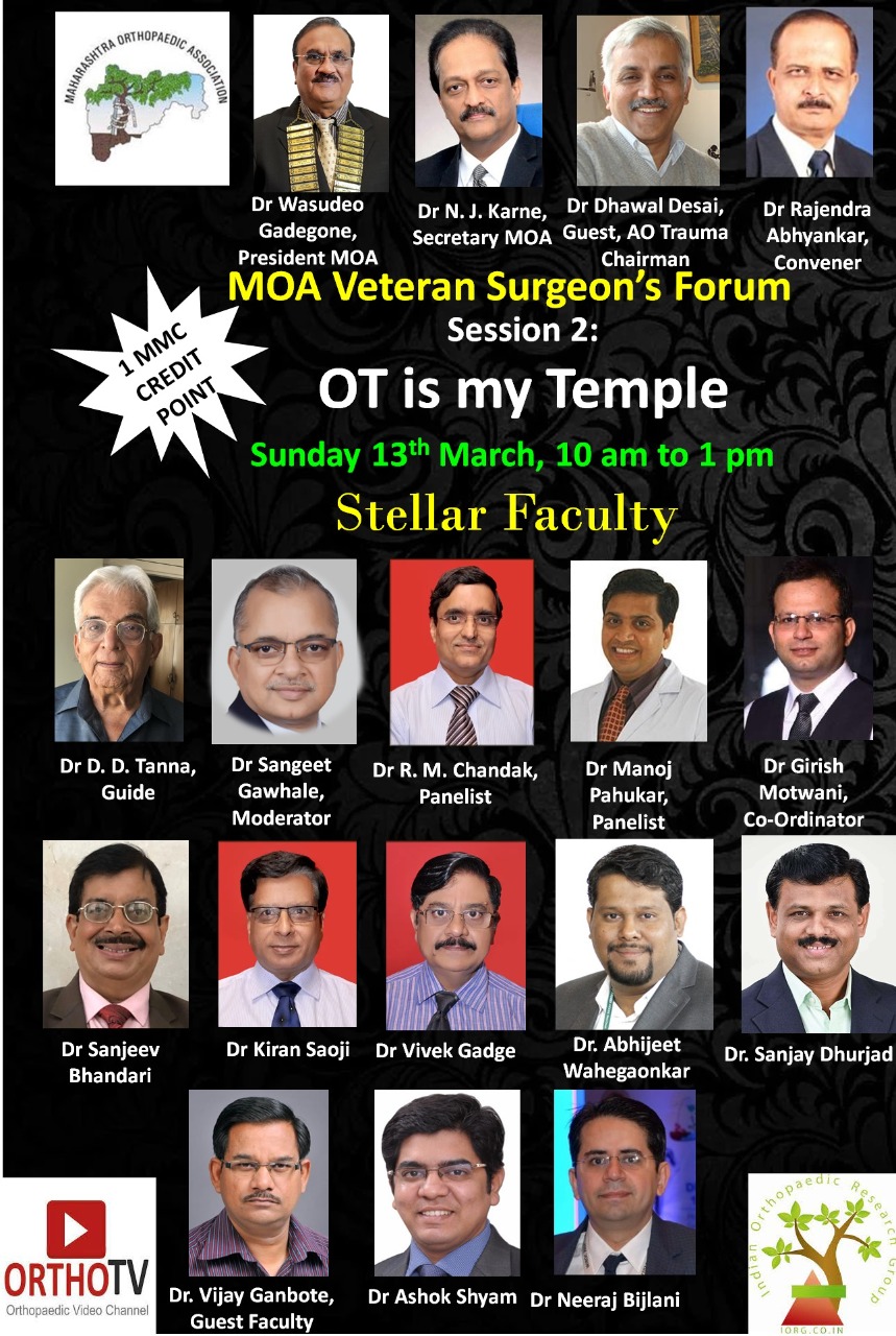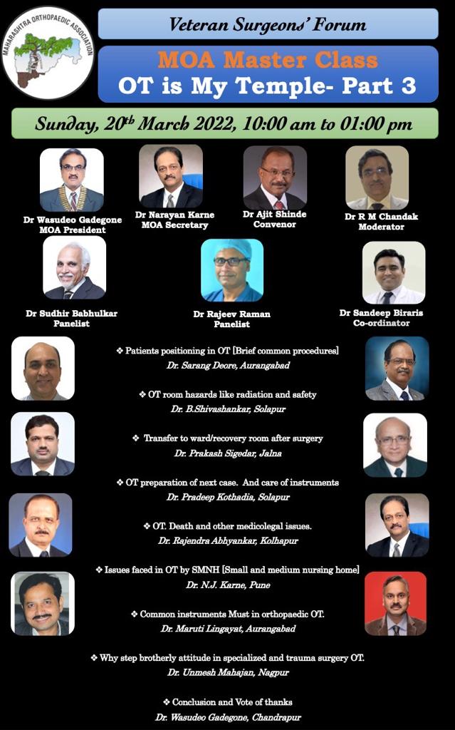 Topic : OT IS MY TEMPLE – Part 3 Previous Next VETERAN SURGEON FORUM MASTER CLASS Maharashtra Orthopaedic Association Topic: OT IS MY TEMPLE – Part 3 Sunday 20th March, 2022, 10 am to 01.00 pm